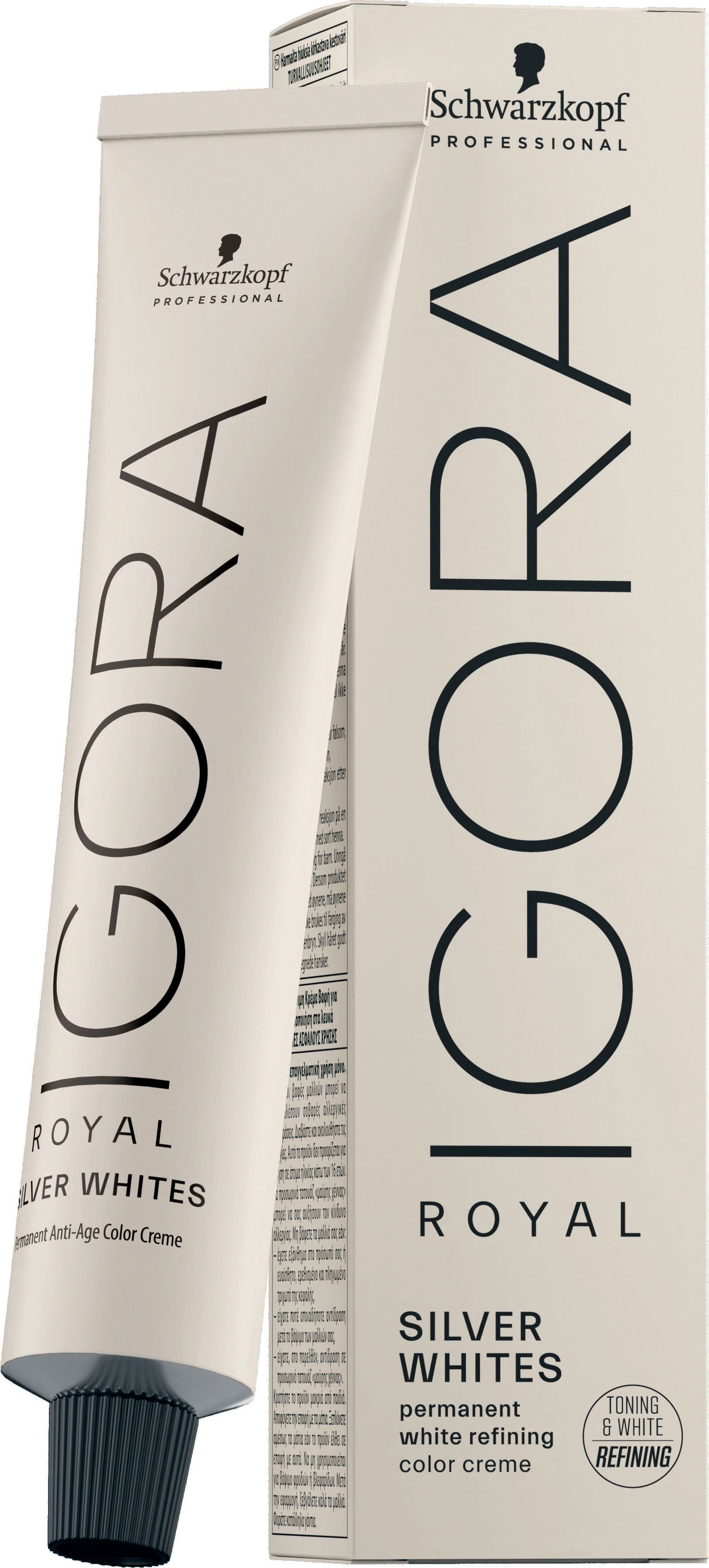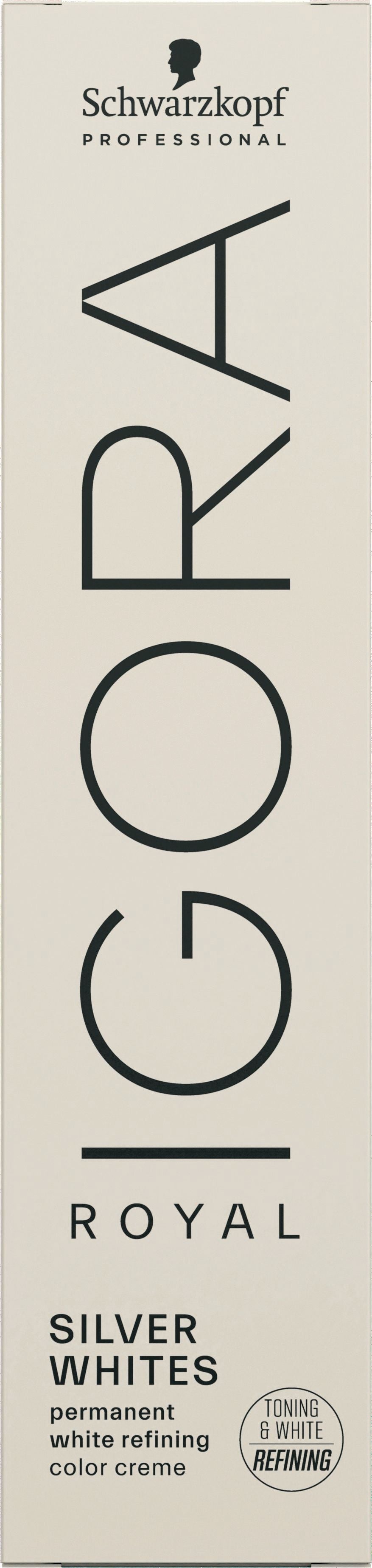 IGORA ROYAL Silver Whites Silver tonal refiner for 70-100% white hair, base 6 and lighter. Beautifying and brightening for white and salt and pepper hair.